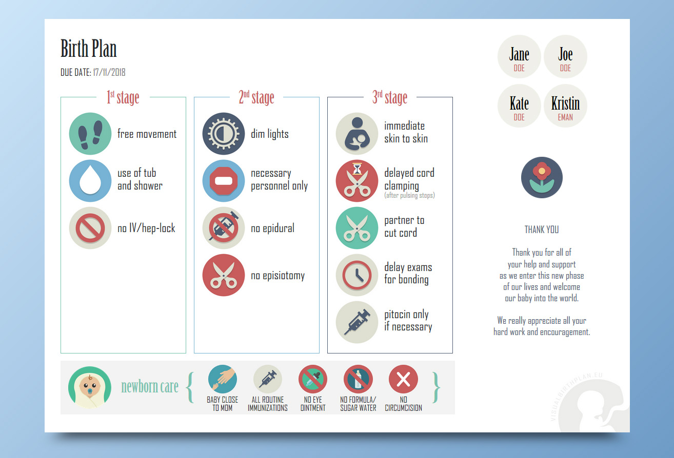 The visual birth plan is a great reminder to you and your birth team that you have choices and that you can make decisions together. Aside from the birth preferences for all stages of labor, the visual birth plan can include six helpful questions to be asked in case of emergencies, names and roles of people on your birth team and crucial details about your pregnancy and health.